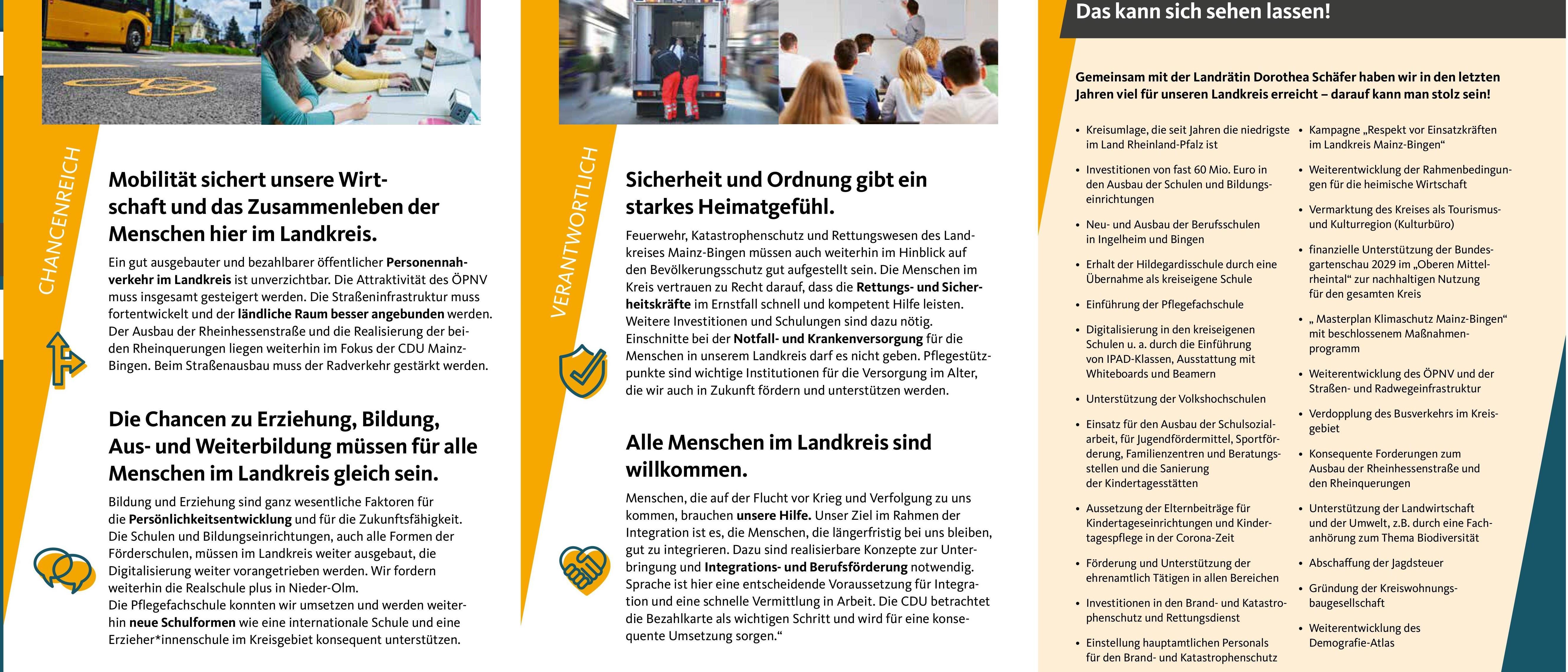 Die CDU Mainz-Bingen will allen Menschen die gleichen Chancen und Zugänge zu Bildung, Aus- und Weiterbildung ermöglichen. Der Kreis unterhält dazu ein umfangreiches Angebot an berufsbildenden und fördernden Schulen, die die weiterführenden Schulen ergänzen.